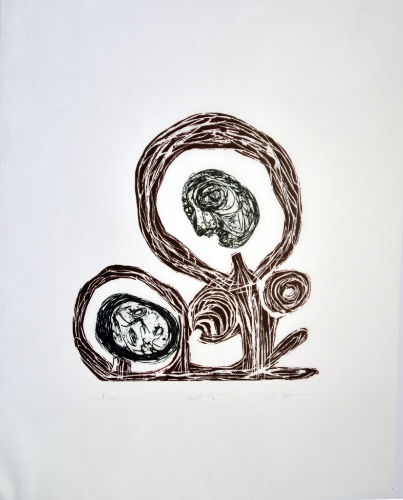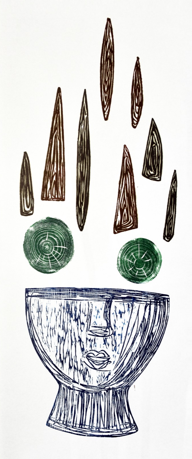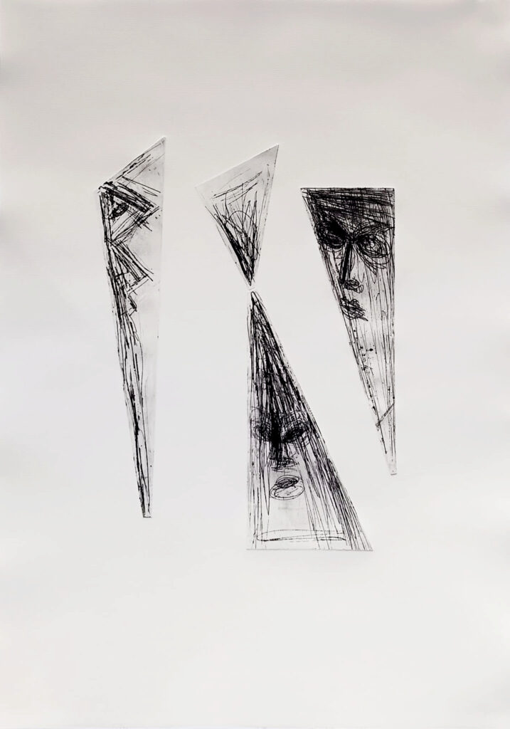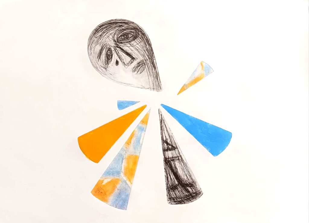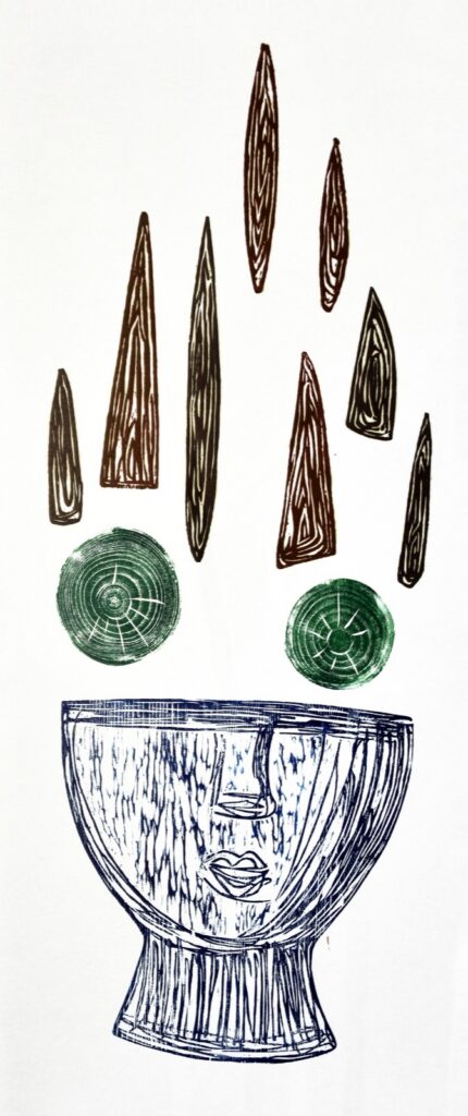 The set of art works called Kaos is the manifestation of the chaos of creation, the epiphany of primordial strength. Starting from recycled wood, I enhance the beauty of the grain, I put together various pieces and I create shapes that reproduce female faces, carving them and printing them to create experimental woodcuts, sometimes combining them in the form of artist’s books . Even in copperplate engravings, I work by shaping zinc plates or plywood boards to create works that combine etchings, collographies and embossing, in various shades of colour. In the oval faces and in the expressive strength of the engraved sign, there is a strong reference to the graphics of Mimmo Paladino and to the Enrico Baj’s phantasmagorical world. The reality disintegrates in front of our eyes such as pieces of wood. Everyone is a spark of the feminine energy from which all creation originates.